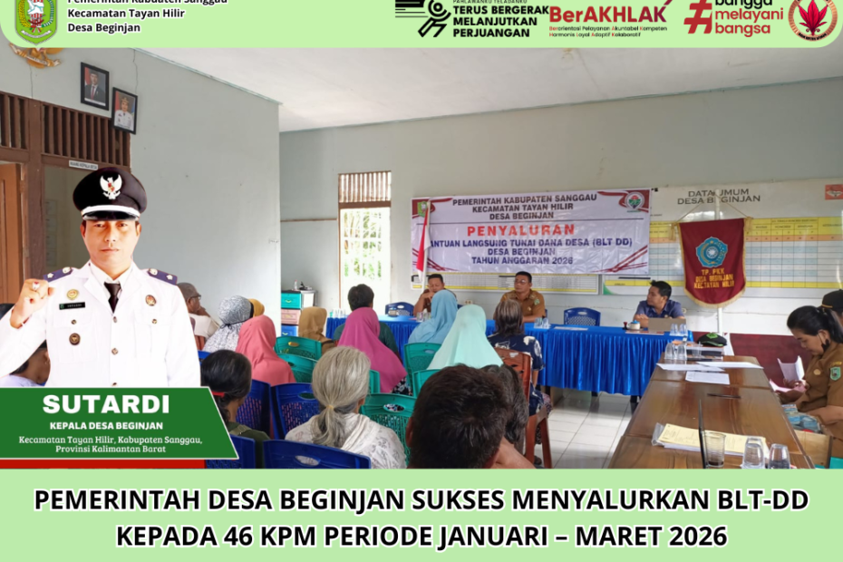 Beginjan, 30 Maret 2026 – Pemerintah Desa Beginjan, Kecamatan Tayan Hilir, Kabupaten Sanggau, telah sukses melaksanakan kegiatan penyaluran Bantuan Langsung Tunai Dana Desa (BLT-DD) kepada 46 Keluarga Penerima Manfaat (KPM) untuk periode Januari sampai Maret Tahun 2026.