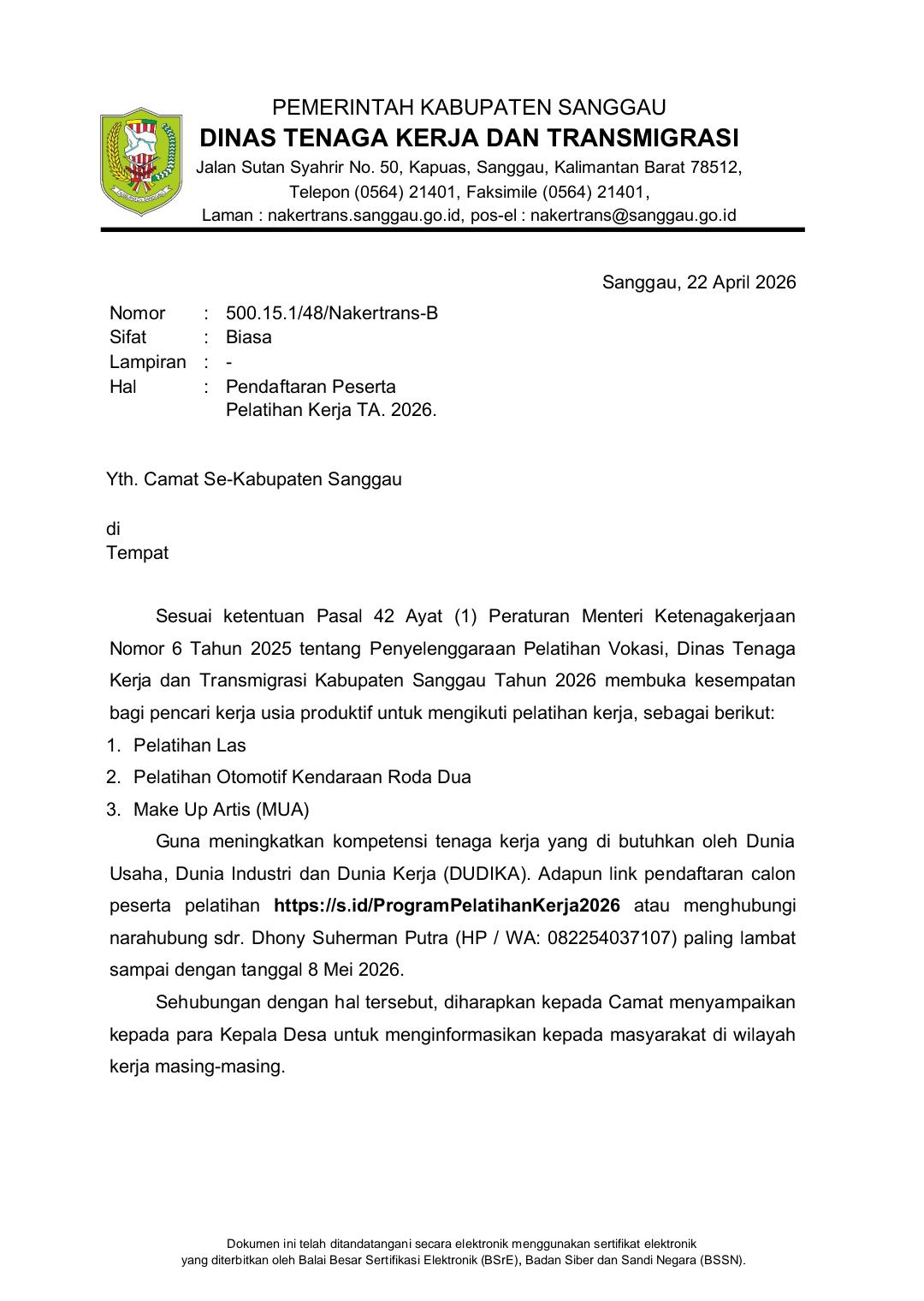 Beginjan, 22 April 2026 – Kepala Desa Beginjan, Bapak Sutardi, menginformasikan kepada seluruh masyarakat Desa Beginjan agar memanfaatkan kesempatan mengikuti program pelatihan kerja yang diselenggarakan oleh Pemerintah Kabupaten Sanggau melalui Dinas Tenaga Kerja dan Transmigrasi.