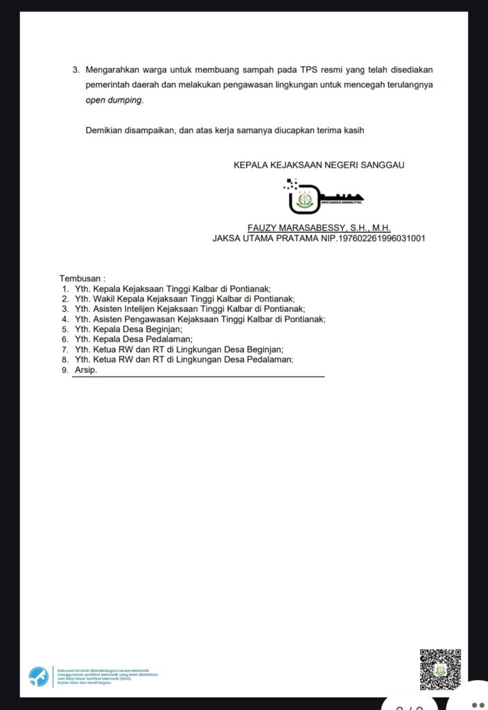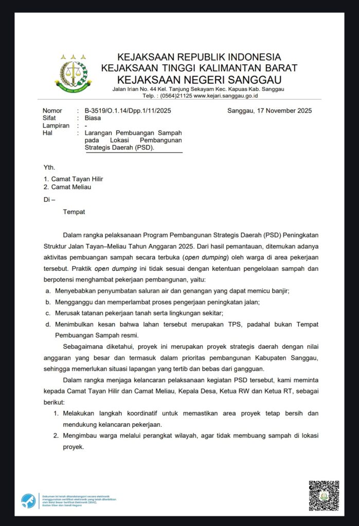 Beginjan, Kamis 4 Desember 2025— Kepala Desa Beginjan, Bapak Sutardi, mengeluarkan imbauan tegas kepada seluruh warga terkait larangan membuang sampah sembarangan di area Pembangunan Strategis Daerah (PSD), khususnya pada lokasi proyek Peningkatan Struktur Jalan Tayan–Meliau Tahun Anggaran 2025. Imbauan ini merujuk pada surat edaran resmi dari Kejaksaan Negeri Sanggau, yang menyoroti masih adanya aktivitas pembuangan sampah secara terbuka (open dumping) di sekitar lokasi pekerjaan.