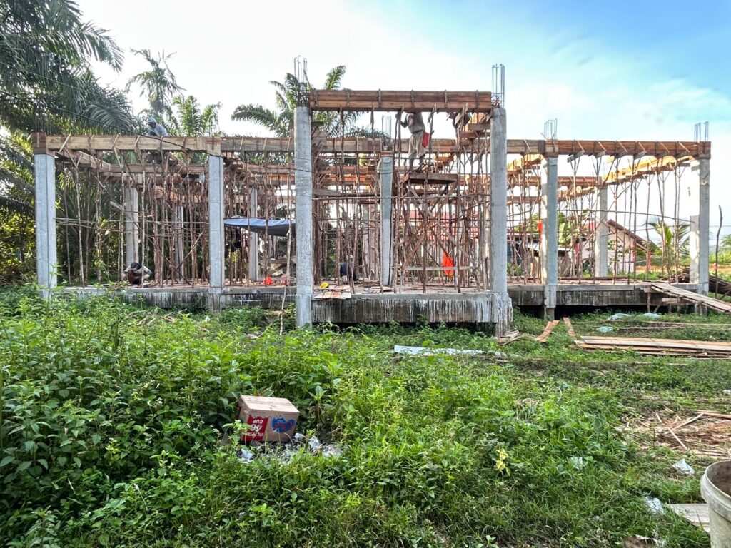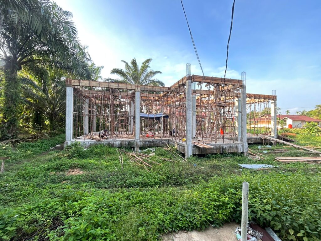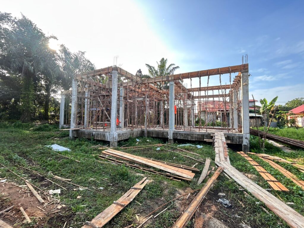 Di lapangan terlihat rangka bangunan yang telah terbentuk jelas, dengan kolom-kolom beton berdiri kuat sebagai struktur utama. Para pekerja juga tampak fokus menyelesaikan pemasangan bekisting kayu dan susunan penyangga untuk balok dan lantai bangunan. Aktivitas konstruksi berlangsung intensif, menandakan komitmen pemerintah desa untuk menghadirkan fasilitas publik yang representatif bagi warga.