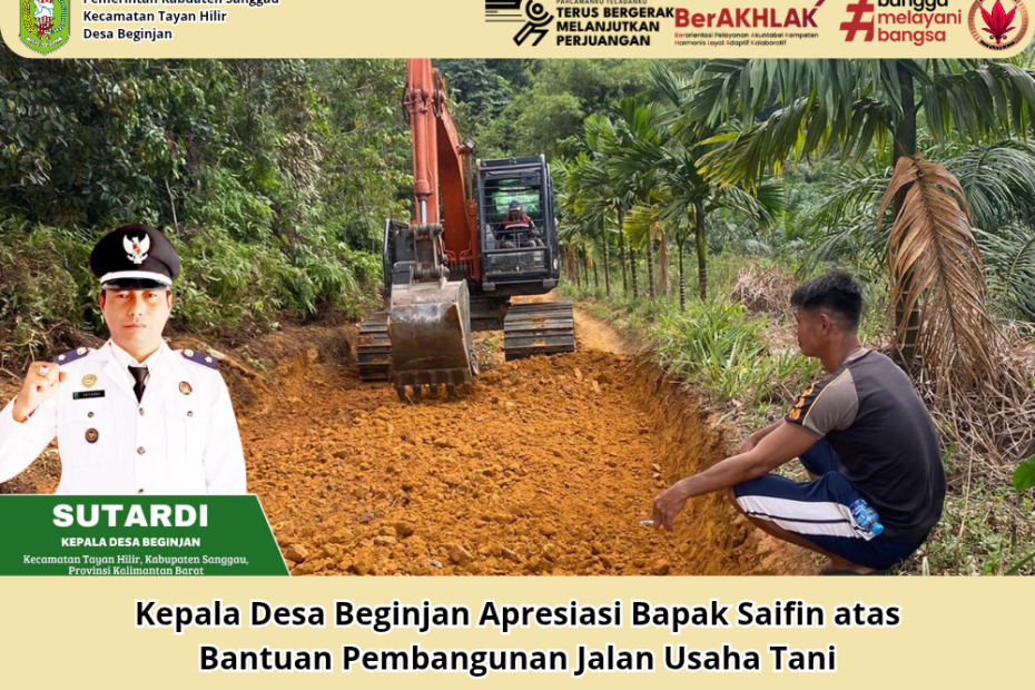 Desa Beginjan, Rabu, 28 Januari 2016. Kepala Desa Beginjan, Bapak Sutardi, menyampaikan ucapan terima kasih dan apresiasi kepada Bapak Saifin, Anggota DPRD Kabupaten Sanggau, atas bantuan pembangunan Jalan Usaha Tani di Dusun Beginjan Desa Beginjan. Jalan tersebut dibangun sepanjang 50 meter dengan lebar 5 meter, dan dinilai sangat membantu masyarakat, khususnya para petani.